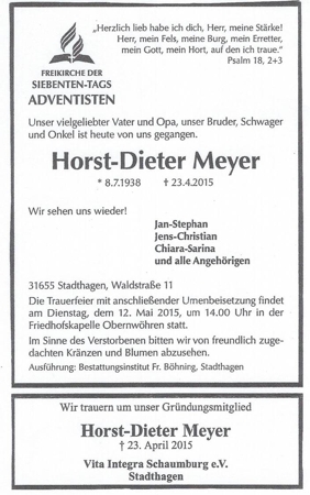 Ja, - wir danken heute unserem Gott und unserem Herrn Jesus Christus, dass er uns Horst-Dieter Meyer gegeben hat und wir danken diesem Gott, der Herr über Leben und Tod ist, dass er ihn zu Ruhe gelegt hat und ihn erlöst hat von seinem Leiden.
